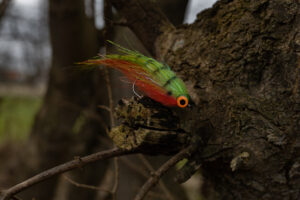 Dette er en klassisk geddeflue efter min mening, og de har helt sikkert sin plads i boksen. Jeg bruger dem selv meget når gedderne ikke vil have mine fluer med haler, som typisk er mit første valg. Det kommer også meget an på det pågælende vand, hvis der bliver fisket meget på gedderne, kan det faktisk være en stor fordel at vælge en mindre flue uden hale. Bundet på Ahrex TP 610 6/0.